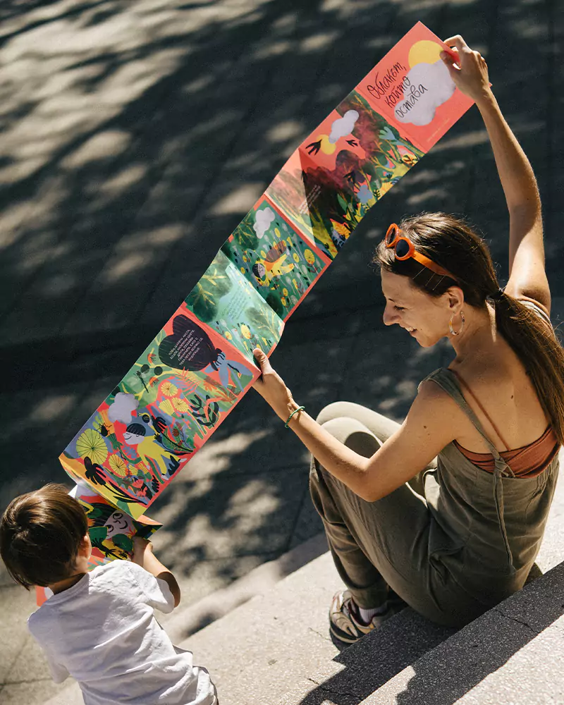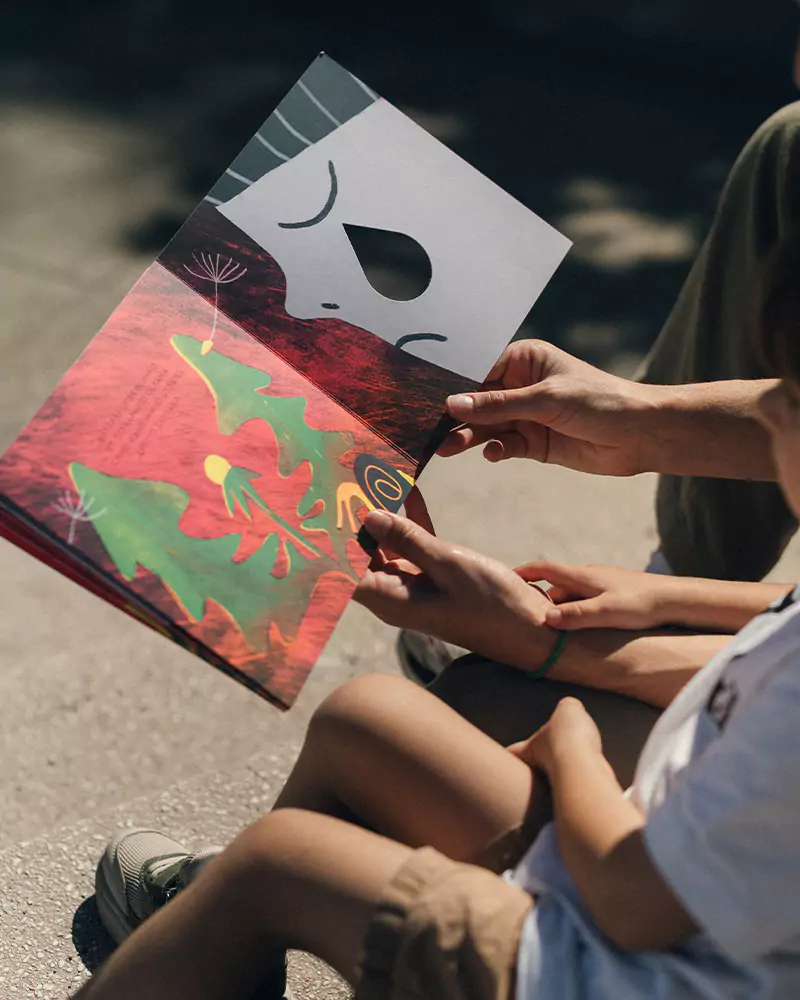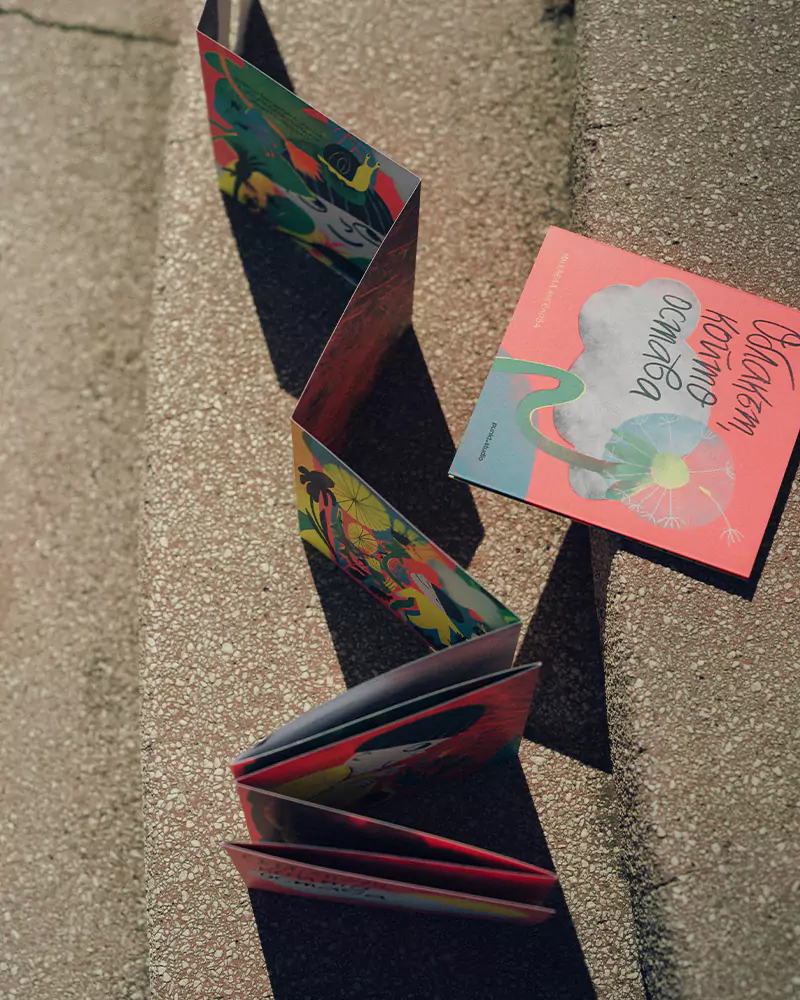The result is a two-sided leporello book about a boy, a dandelion, and a cloud that lingers. On one side, the cloud brings a storm and takes the flower from the child’s hands. On the other hand, the rain nourishes the world, bringing back even more color and life.
